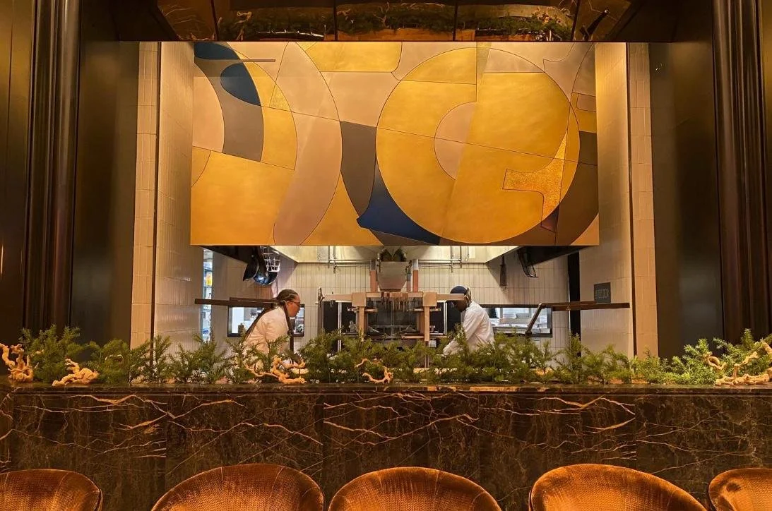 Designed by The Rockwell Group, a feature of their design is an original metal collage wrapped around the restaurant’s open kitchen, produced by Italian metal masters De Castelli. Based on Belgian artist Jesse Willems’ original collage, De Castelli fabricated this stunning work of art, combining various custom metal finishes and textures. The massive metal collage is over 7 feet high and 28 feet across – wrapping around the hood of the restaurant’s open grill.